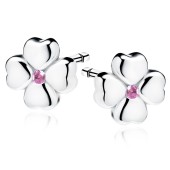 Cercei argint placati cu rodiu trifoi norocos cu piatra roz si prindere cu surub