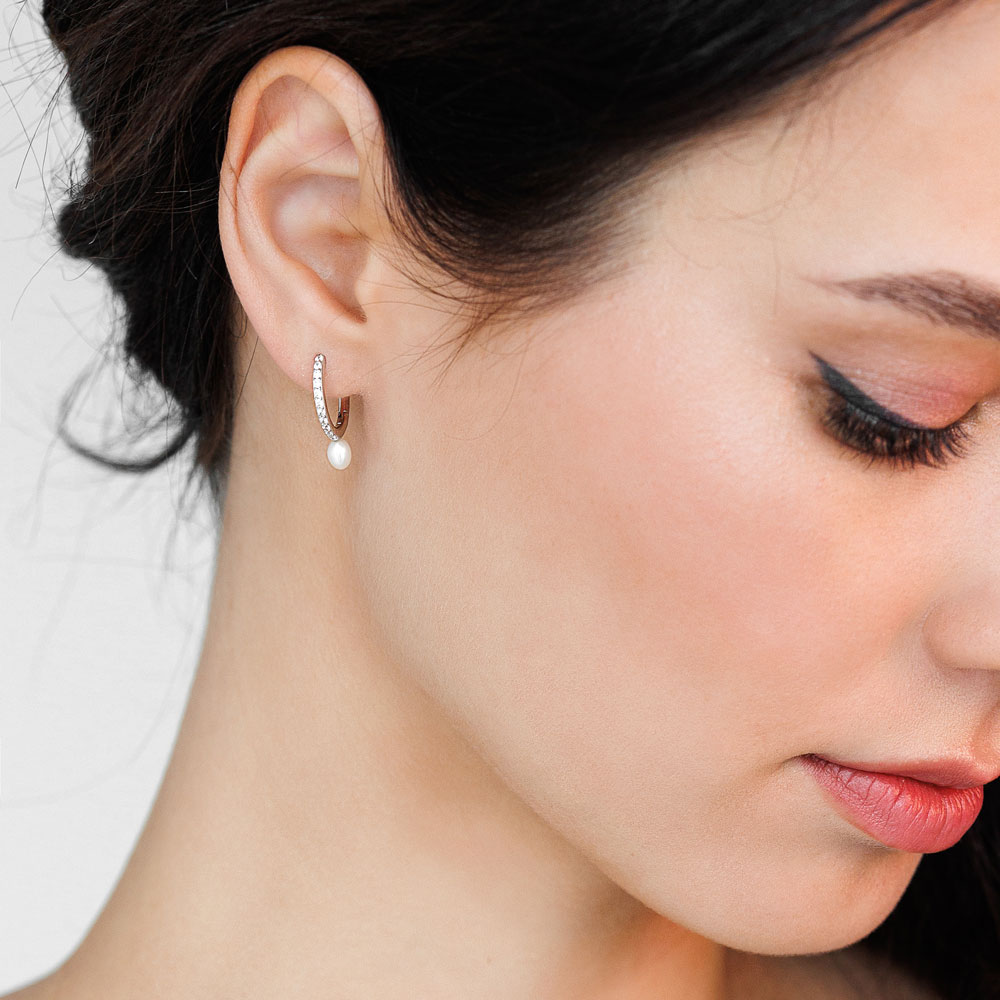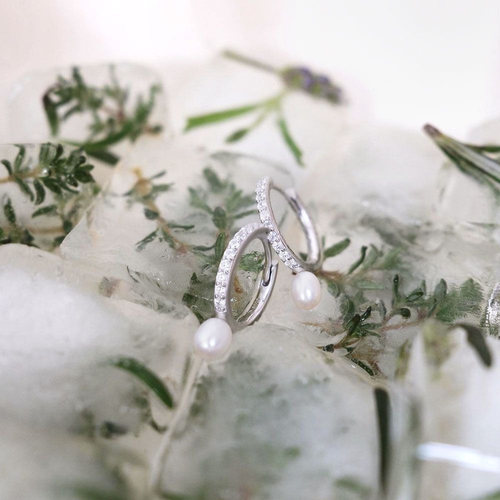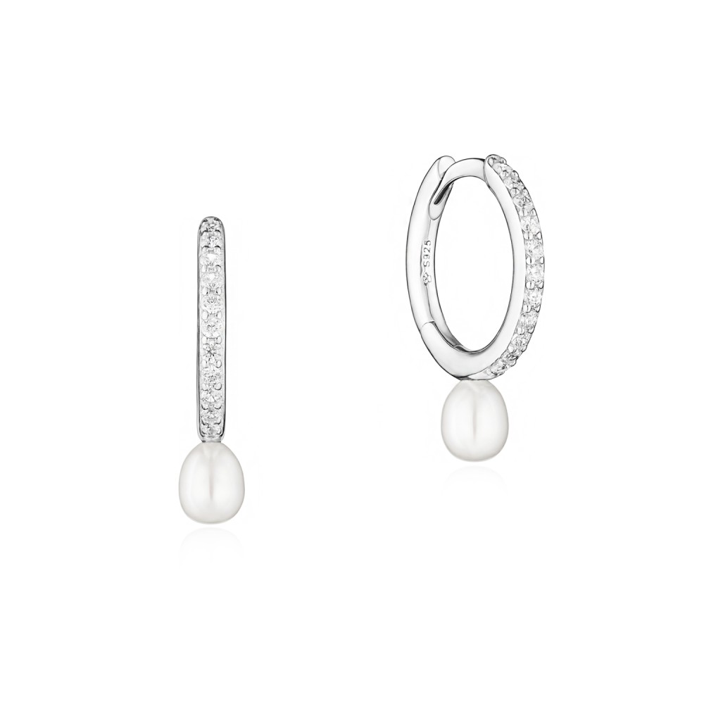 Cercei cu perle naturale albe și cristale, realizați din argint