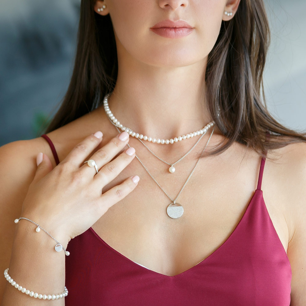 Colier cu lantisor dublu de argint cu perla naturala alba si pandantiv cu pietre