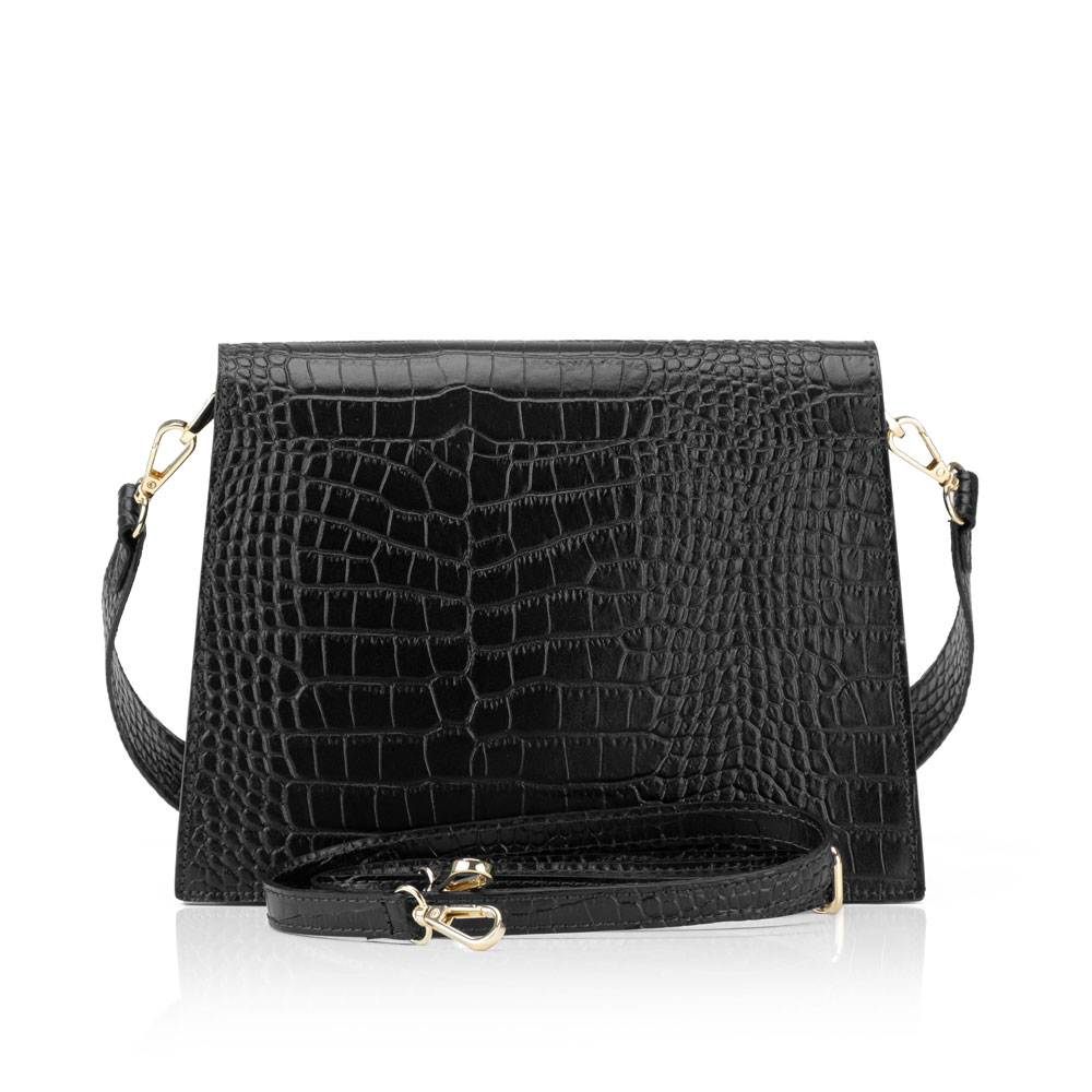 Geantă damă, de umăr, din piele naturală lăcuită cu textură croco, culoare neagră