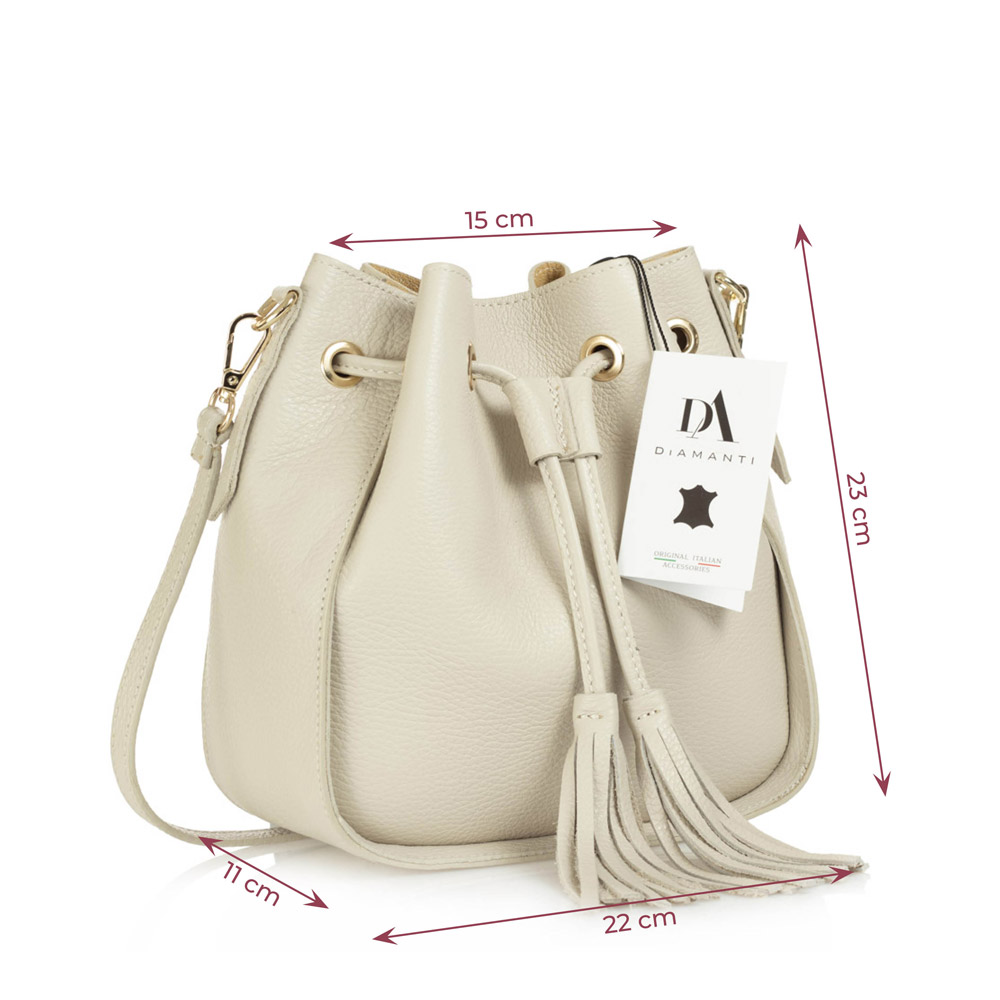 Geanta DiAmanti Ottavia este o geanta realizata din piele naturala, cu aspect usor texturat. Este o geanta de umar stil bucket, avand un snur din piele cu ciucuras, care ii da un plus de personalitate.