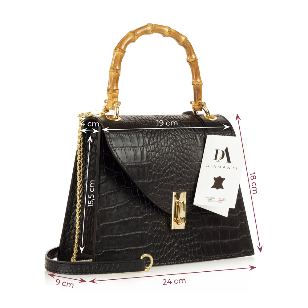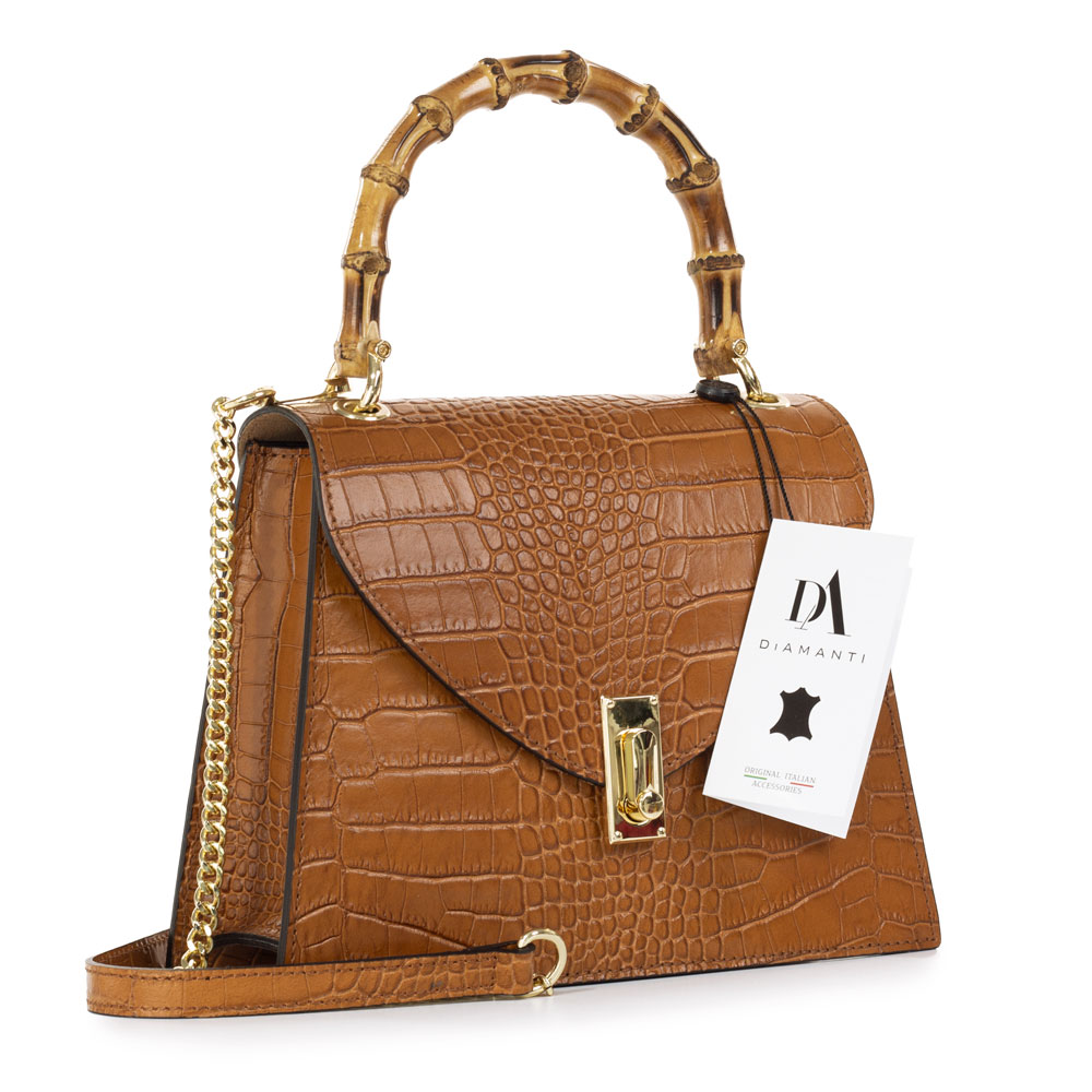 Geanta DiAmanti Michele este o geanta realizata din piele naturala cu aspect de piele de crocodil. Un plus de personalitate este dat de manerul din lemn de bambus.