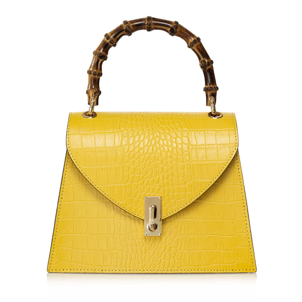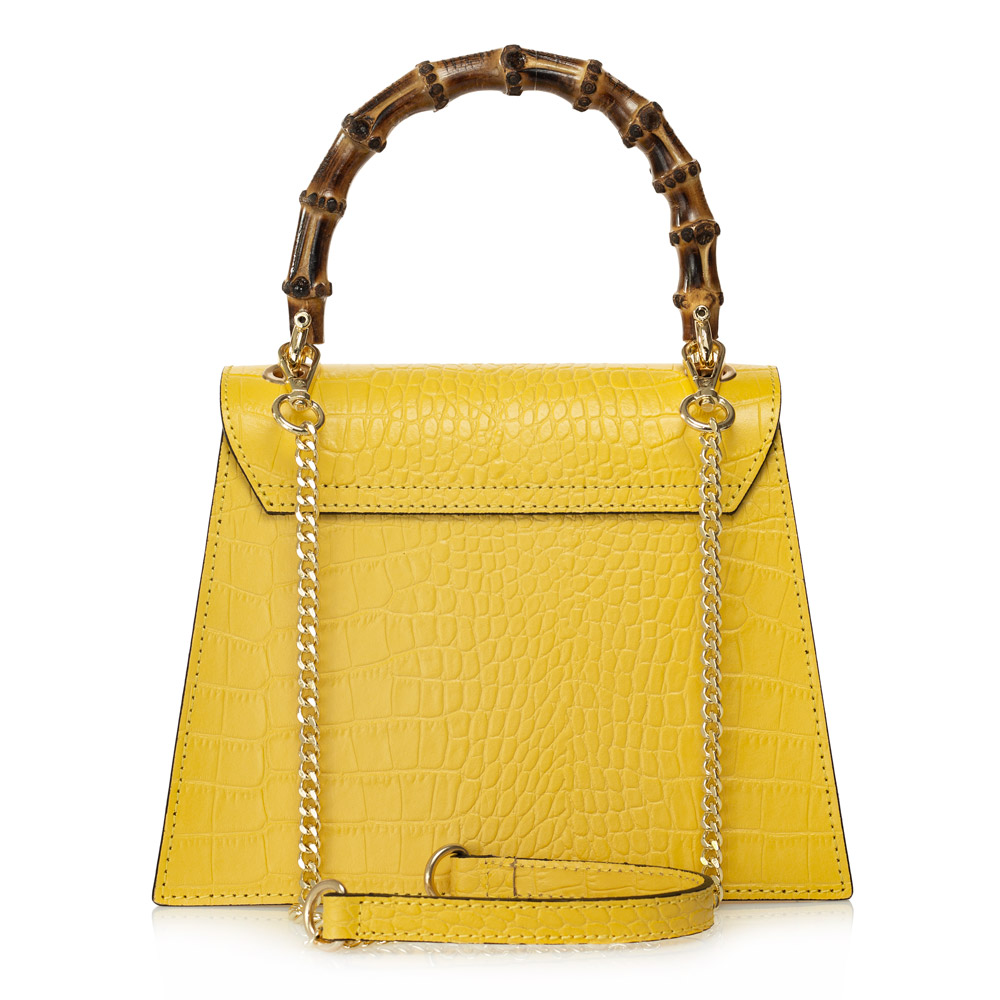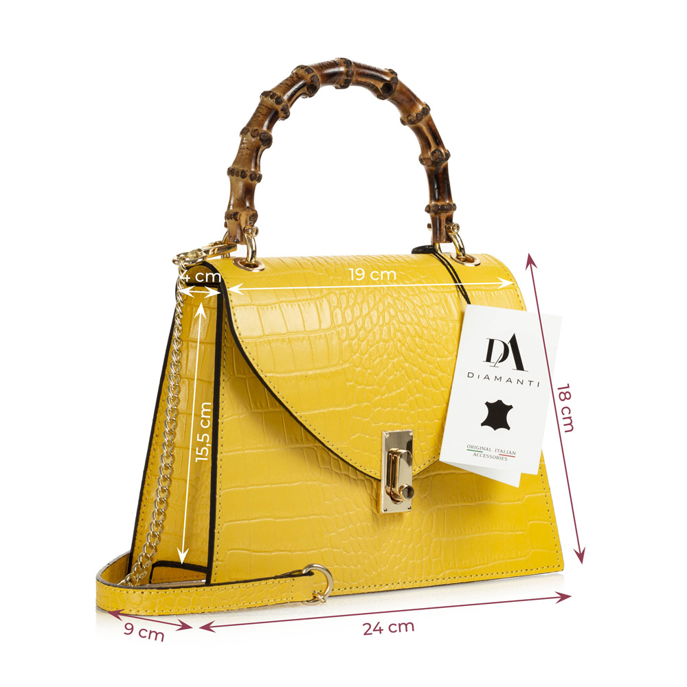 Geanta DiAmanti Michele este o geanta realizata din piele naturala cu aspect de piele de crocodil. Un plus de personalitate este dat de manerul din lemn de bambus.