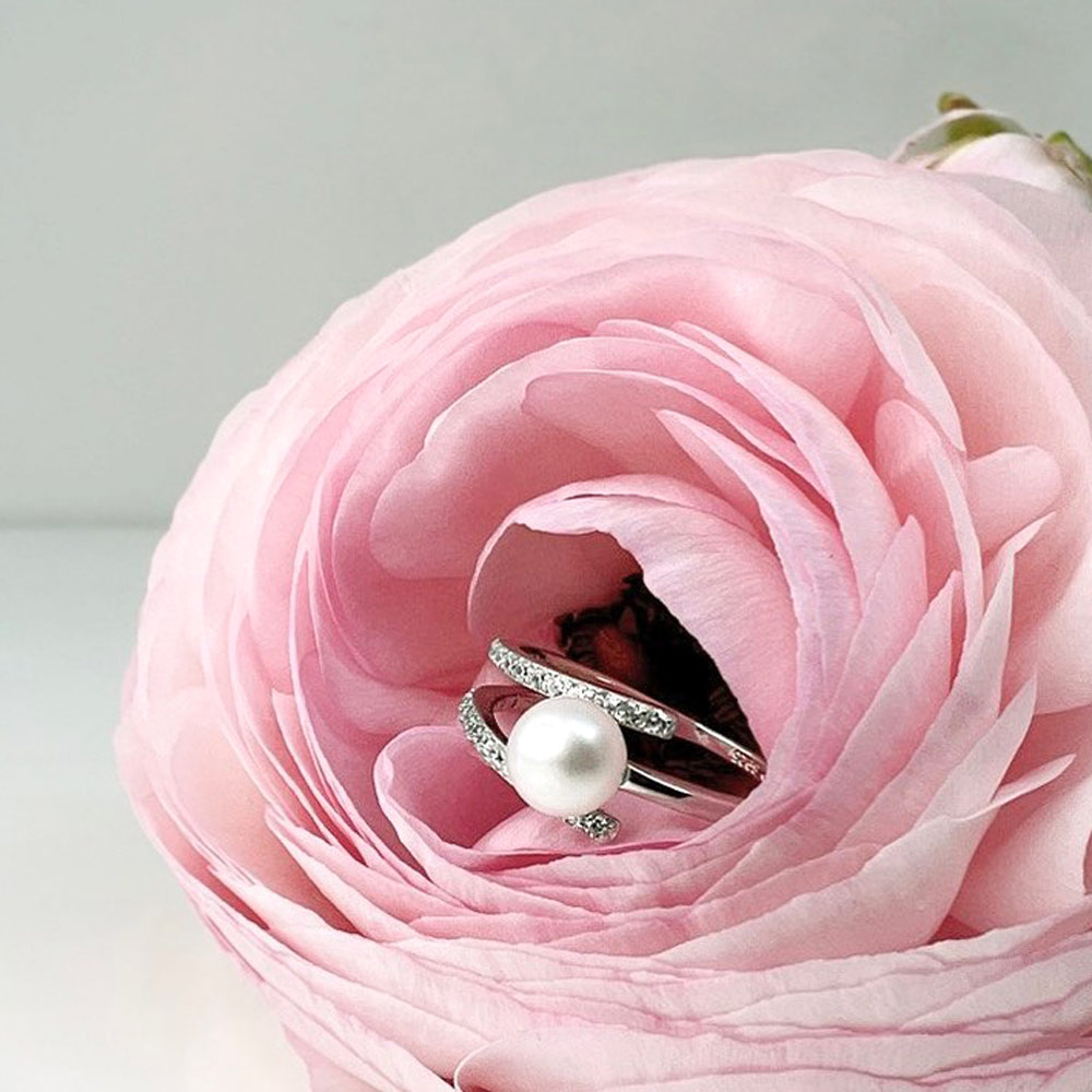 Inel cu perla naturala alba si cristale zirconiu din argint